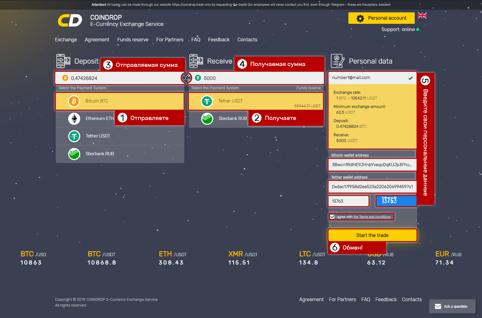 5. После поступления средств мы отправим вам криптовалюту на указанный кошелек/карту.